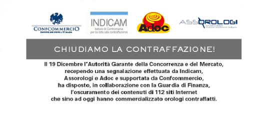 CONFCOMMERCIO – INDICAM – ADOC – ASSOROLOGI Il 19 Dicembre l’Autorità Garante della Concorrenza e del Mercato, recependo una segnalazione effettuata da Indicam, Assorologi e Adoc e supportata da Confcommercio, ha disposto, in collaborazione con la Guardia di Finanza, l’oscuramento dei contenuti di 112 siti Internet che sino ad oggi hanno commercializzato orologi contraffatti Il provvedimento intende impedire la vendita […]